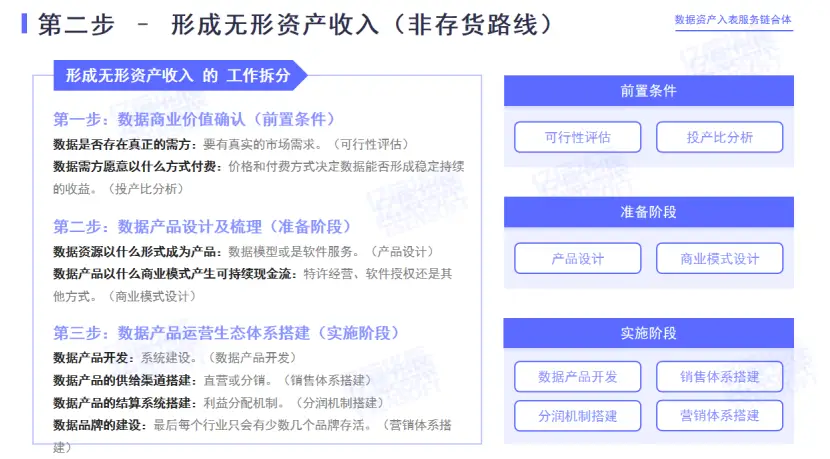 如果走的是非存貨、即無(wú)形資產(chǎn)路線的話,能有效地規(guī)避現(xiàn)在由于政策供給層面沒(méi)有跟上導(dǎo)致的數(shù)據(jù)確權(quán)問(wèn)題。因?yàn)槿绻邿o(wú)形資產(chǎn)路徑的話,就不是直接賣數(shù)據(jù),而是提供數(shù)據(jù)服務(wù)。比如對(duì)于部分不能直接出售的數(shù)據(jù),可以軟件或者其他的方式脫敏,然后提供一個(gè)計(jì)算結(jié)果,在此過(guò)程中,由于看不到原始數(shù)據(jù),從某種意義上就能避免一些法律上的問(wèn)題。這些交易也能證明資產(chǎn)預(yù)期會(huì)給企業(yè)帶來(lái)的經(jīng)濟(jì)利益。只有證明了預(yù)期的價(jià)值,才能用收益法跟市場(chǎng)法給資產(chǎn)估個(gè)好價(jià)。