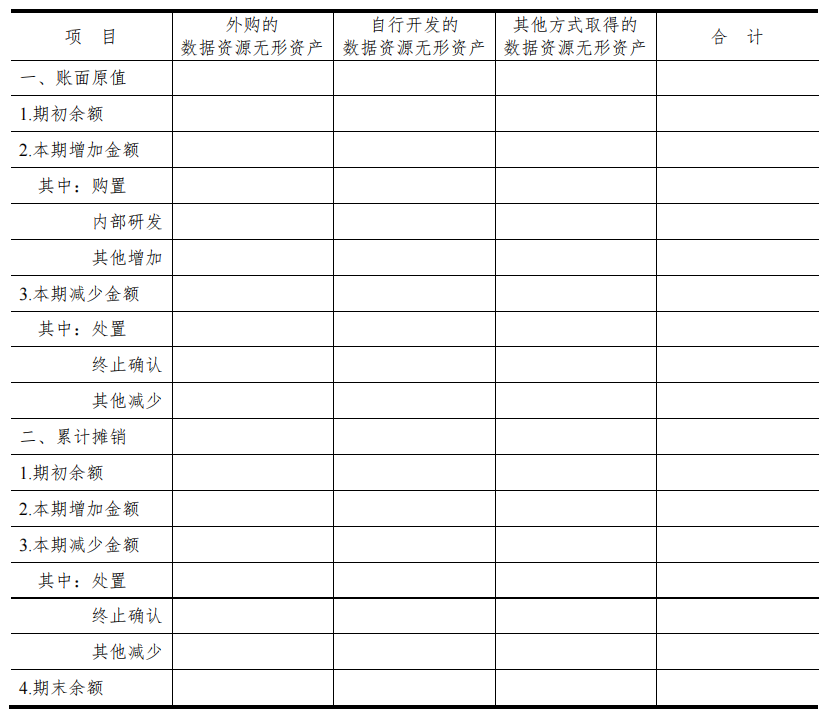 先來看數據資源無形資產的會計信息披露,根據新規,企業需按照相關會計準則,在財務報表的附注中披露無形資產的相關會計信息,披露內容應包括無形資產的賬面價值、累計攤銷額、減值準備以及未來攤銷計劃等。具體表格大概“長”成這樣:
