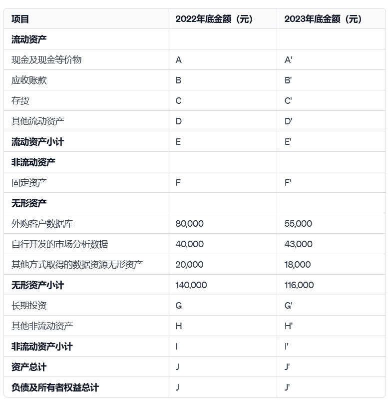 為了簡化分析,我們只分析跟數據資產相關的會計項目,其他項目用字母代替,并分析2022、2023年的情況。