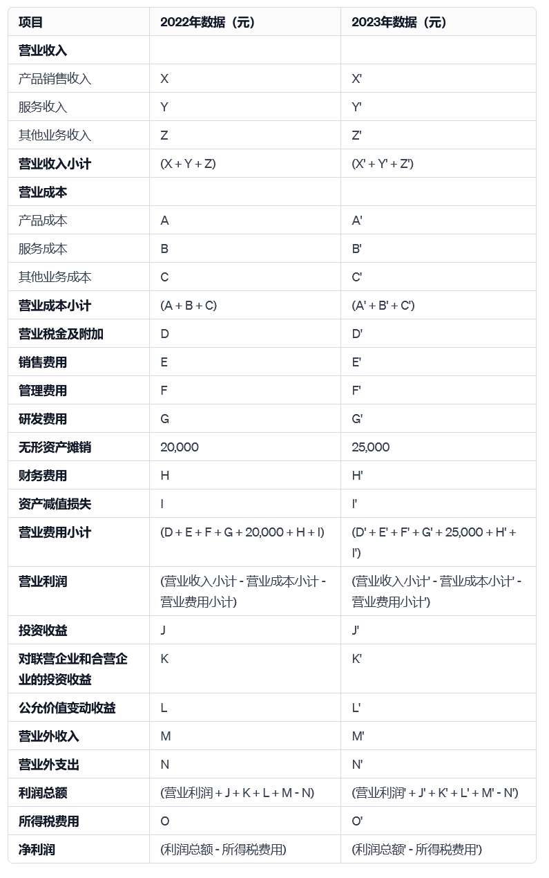在上表中,無形資產攤銷從2022年的20,000元增加到2023年的25,000元,反映了新購置的無形資產或對現有無形資產更快的攤銷速度,無形資產攤銷的變化對營業費用和凈利潤產生了顯著影響。