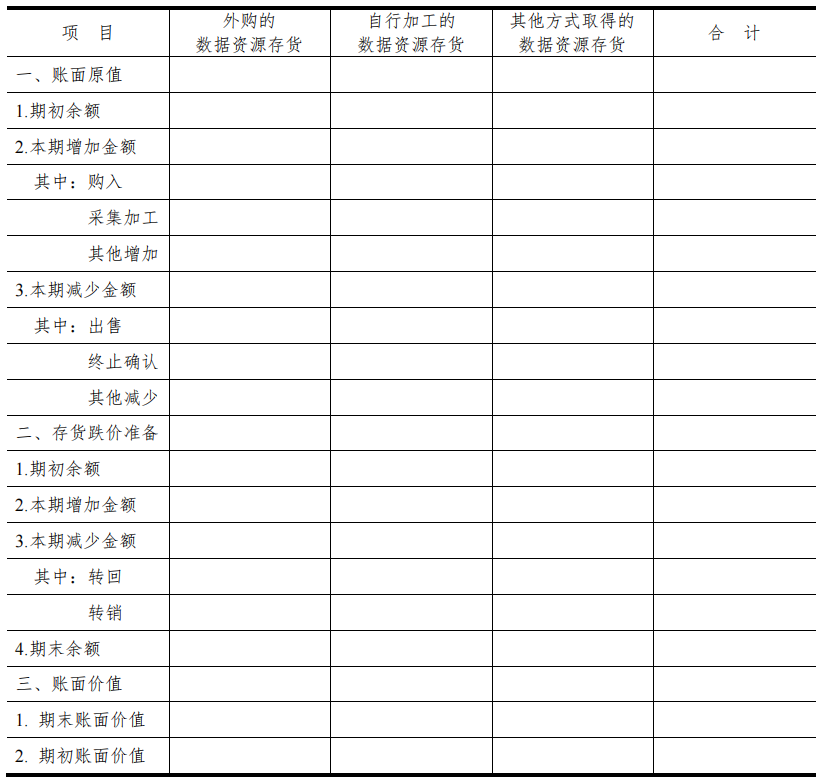 根據《規定》,企業應當按照外購存貨、自行加工存貨等類別,對確認為存貨的數據資源(以下簡稱數據資源存貨)相關會計信息進行披露,并可以在此基礎上根據實際情況對類別進行拆分。以下是信息披露的格式要求: