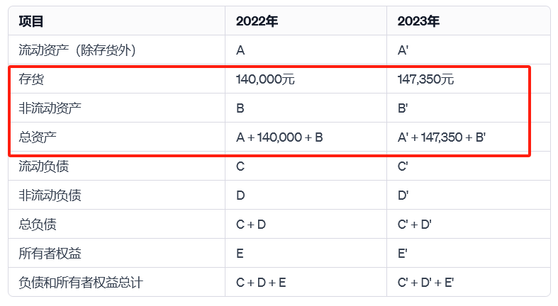 在這個表格中,存貨的增加從2022年的140,000元到2023年的147,350元直接影響了資產負債表中的流動資產和總資產。