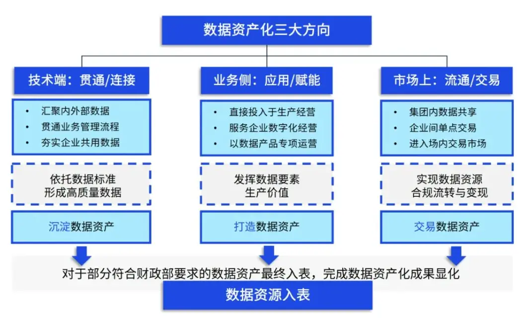 數據資源在資產化的過程中,以“技術、業務、市場”三大方向實現數據資產化并最終完成入表,實現數據資產化成果在企業資產負債表上的“完全顯化”。