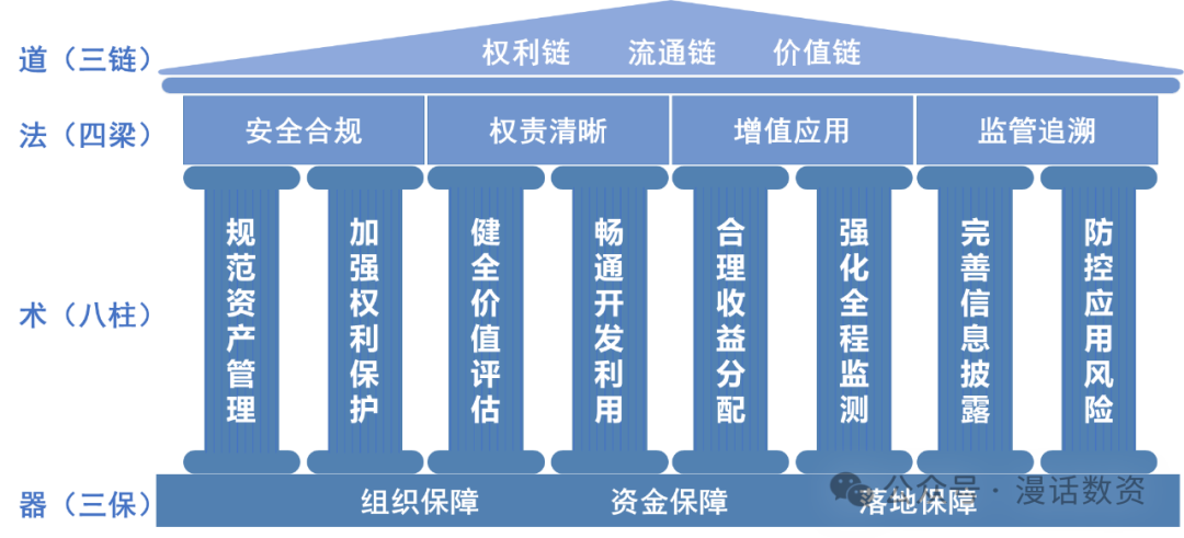 法篇包括安全合規、權責清晰、增值應用和監管追溯四個部分,綜合體現數據資產管理的四項基本原則:安全合規為執行底線,權責清晰為必要前提,增值應用為目標牽引,監管追溯為防控手段。是推動數據資產管理工作的重要依據。