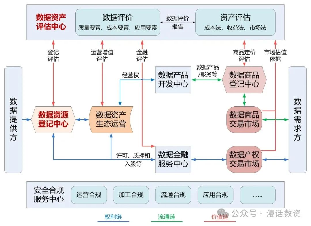 首先,關于數據資產的定義,目前官方正式發布的有以下兩個:定義一:合法擁有或者控制的,能進行計量的,為組織帶來社會和經濟價值的數據資源?!醋訥B/T 40685-2021《信息技術服務 數據資產 管理要求》定義二:特定主體合法擁有或者控制的,能進行貨幣計量的,且能帶來直接或者間接經濟利益的數據資源?!醋浴稊祿Y產評估指導意見》以上關于數據資產的定義中有三個關鍵詞是雙方一致認同的:①合法擁有或者控制的;②能計量;③能帶來價值或者利益。由此可以引出數據資產管理的三條核心主線,即權利鏈,流通鏈,價值鏈。三鏈的關系如下圖: