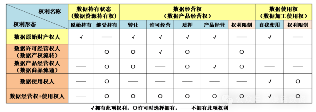 2、權責清晰清晰界定數據資產權責是數據資產管理工作的必要前提,也是促進數據要素市場價值流通的重要環節。關于數據資產權責。落實《數據二十條》數據資源持有權、數據加工使用權和數據產品經營權的權利分置要求,構建數據資產產權體系,明晰數據資產權責邊界,促進數據資產流通應用安全、可追溯。數據產權矩陣見下圖: