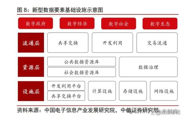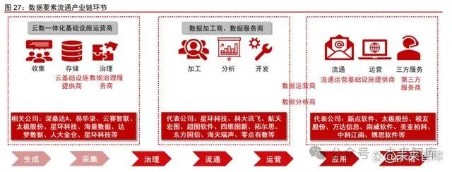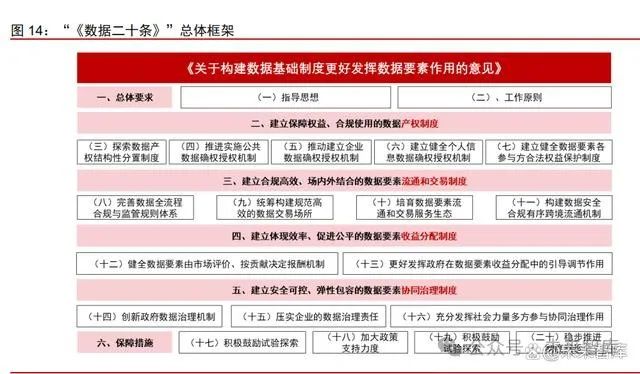 1)數據產權方面,數據資源持有權、數據加工使用權、數據產品經營權“三權分置”,厘清權屬之間的關系,避免模糊地帶摩擦,對企業在生產經營中控制的數據進行了清晰的 分類和權屬界定。其中,“強化使用權、放活經營權”為企業的數據開發利用、數據產品 交易提供更多機會。2)流通交易方面,從規則、市場、生態、跨境“四方面”構建合規 高效、場內外結合的數據要素流通和交易制度,驅動數據流通交易規范化,為企業逐步由 場外交易向場內交易轉移提供動力。3)收益分配方面,兼顧“效率”和“公平”,按照“誰 投入、誰貢獻、誰受益”原則進行初次分配,再分配階段則重點關注公共利益和相對弱勢 群體。當前數據提供方包括以政府為代表的公共數據以及企業和個人數據,需求端覆蓋政 務、金融、工業等多方面,此外數據服務商以及數據交易平臺可為數據要素的價值釋放提 供增值服務。4)協同治理方面,在界定企業數據治理責任的同時明確政府監管紅線,構 建政府、企業、社會多方協同的治理模式。明確責任與監管要求,有助于健康可持續發展。
