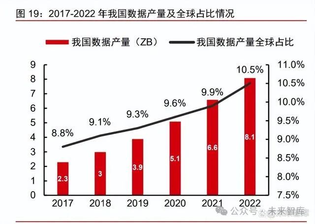 目前我國數據產量、數據經濟規模位居全球第二。根據中國信通院,2022 年我國數 據產量達 8.1 ZB,同比增長 22.7%,占全球數據總產量 10.5%,位居世界第二;我國數 據存儲量達724.5EB,同比增長 21.1%,占全球數據總存儲量的 14.4%。2022 年我國 數字經濟規模達50.2 萬億元,穩居世界第二。2023 年 2 月,中共中央、國務院印發《數 字中國建設整體布局規劃》,其中提到“十四五”期間實現我國數字經濟核心產業增加值 占 GDP 比重由 7.8%提升至 10%的目標。