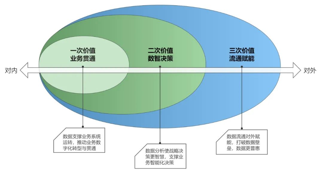 數據要素究竟如何發揮其作為生產要素的價值,需要進一步分析厘清。隨著信息技術的發展和產業應用的演化,數據要素投入生產的途徑可分為三次價值釋放過程,即數據支撐業務貫通、數據推動數智決策、數據流通對外賦能,如上圖所示。需要注意的是,之所以說這三次價值是數據要素價值釋放的三條途徑,是因為一方面這三次價值之間存在一種遞進關系,后者往往以前者為基礎;另一方面,這三條途徑存在一種并列關系,這些價值可以且有必要同時予以關注、同時充分釋放。