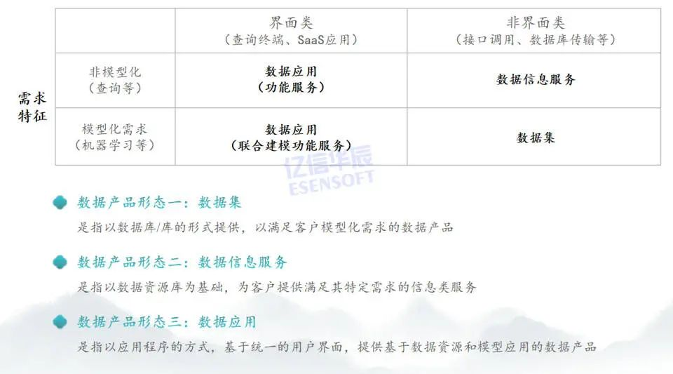 通過需求特征和服務方式就可以把整個產品形態分成三種形態包括數據集、數據信息服務、