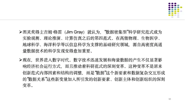 數據產業鏈條中,各環節參與方的行為和以往不一樣,這個方面要研究的新問題很多。因為最近我在做一項數字時代創新問題研究,就拿它舉例。現在數據創新范式按照國內外的很多學者來說,進入了“數據密集型”的科研創新范式。我們能看到除了數字行業自身以外,生物醫學、高能物理、地球科學、海洋科學很多都是以信息科學為支撐的基礎研究領域,如果數據觀測處理能力不高,它們的進展是非常困難的。生命科學中,蛋白質怎么預測出來,不是生命科學自身的原創性發現,而是數字技術應用帶來的結果,其中的原理早就知道,但就是算不出來。現在,世界進入數字時代。數字技術迅速發展和海量數據的產生不僅顯著影響經濟社會運行方式,而且推動著科研范式的深刻變革。這種變革不是原來創新范式內部因素和結構的調整,而是“數據”這個新要素和數據復雜交互形成的“數據關系”這些新變量加入所引發的創新要素、創新主體和創新組織的深刻變革。
