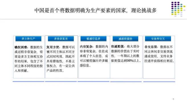 數據是一個生產要素,又是一個非常特別的要素,面臨的理論挑戰非常多。數據的獨特性質主要體現在以下幾個方面。首先是多主體生產因而確權困難,數據的生成過程錯綜復雜,常常是多方主體相互協作的結果,包含了不同主體不同程度的投入和貢獻,因此確權困難。其次是多場景復用方便,一組數據可以被不同主體以不同方式重復利用,在使用上不具有競爭性和排他性,不易清晰明確主張權力。第三是數據中的敏感信息多,許多數據的內容多層次多元化,可能承載了需要保護的個人信息和商業機密,即使匿名化和去標識化,也有可能被挖掘出來。第四是減損貶值快,絕大部分數據的價值在于實時性,有研究表明一年期以上的數據貶值達到98%以上,保值增值十分困難。各位想想,你經常點什么外賣,搜索過什么類型的服務、APP就會推薦推送給你相關的內容,這都是從即時數據中挖掘到的,幾個月后可能你的口味發生了變化,按照現在數據推送就沒有意義。第五是具有交易和交互兩類流通方式,特別是交互型流動即數據在不同主體間的非交易型流通使用,與其他生產要素流通使用的形態相比有顯著不同。這個是我們后面要分析的重點問題。