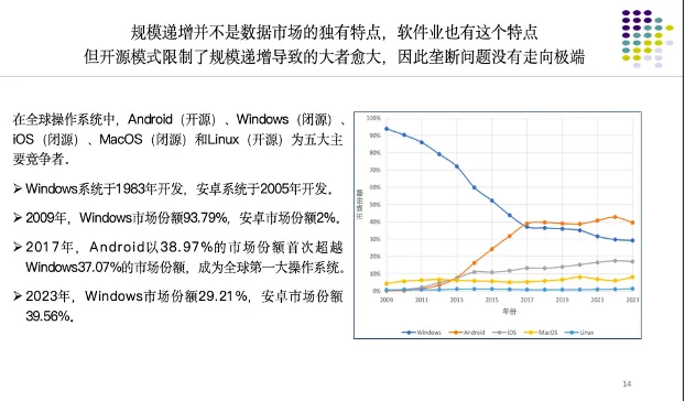 看待數據市場,需要研究市場的規則、行為和結構,特別是AI出現以后的“小規模企業+巨大市場”是非常具有挑戰的問題,對規模遞增下的競爭和壟斷的分析也是我們的一個困惑。我們不能簡單地認為市場從長期看會解決這個問題的,然后完全交給市場去處理。規模遞增并不是數據市場的獨有特點,軟件業也有這個特點,但開源模式限制了規模遞增導致的大者愈大,因此壟斷問題沒有走向極端。雖然領先者有規模遞增的能力,但是開源之后,更多的開發者和應用市場出現,目前沒有導致規模遞增一定會致使大者越大、強者越強的局面出現。