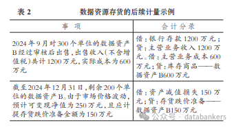 在數據資源存貨的后續計量方面,企業在資產負債表日需要對存貨按照成本與可變現性可變現凈值孰低進行計量。當存貨成本高于其可變現凈值時,則需要計提存貨跌價準備,計入當期損益。企業在資產負債表日,應以確鑿證據為基礎去確定數據資源存貨的可變現凈值。發生跌價的,應當按照可變現凈值計量,同時按照其成本高于可變現凈值的差額計提跌價準備,并計入當期損益中。案例企業數據資源存貨的后續計量方法如表2所示。