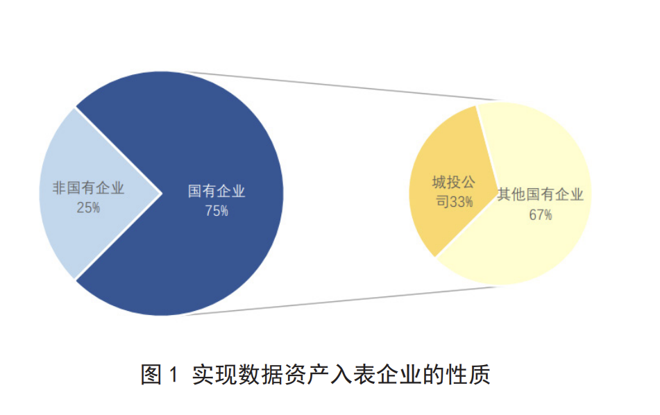 本文選取了截止2024年初實(shí)現(xiàn)數(shù)據(jù)資產(chǎn)入表的20家企業(yè)進(jìn)行統(tǒng)計(jì)分析。如表1所示,入表數(shù)據(jù)多為在公共管理領(lǐng)域中產(chǎn)生的數(shù)據(jù)。結(jié)合涉及數(shù)據(jù)資產(chǎn)入表企業(yè)的性質(zhì),我們分析發(fā)現(xiàn),在實(shí)現(xiàn)數(shù)據(jù)資源入表的企業(yè)中,非國(guó)有企業(yè)共有5家,占比25%,國(guó)有企業(yè)共有15家,占比75%,在這15家國(guó)有企業(yè)中,城投公司占比超過三成。分析結(jié)果表明,由于國(guó)有企業(yè),特別是城投公司在日常經(jīng)營(yíng)過程中會(huì)形成較多的具有公共屬性的數(shù)據(jù)資源,因此更易于識(shí)別、整理、評(píng)估和計(jì)量這些數(shù)據(jù),實(shí)現(xiàn)數(shù)據(jù)資源化向數(shù)據(jù)資產(chǎn)化和數(shù)據(jù)資本化的轉(zhuǎn)變。