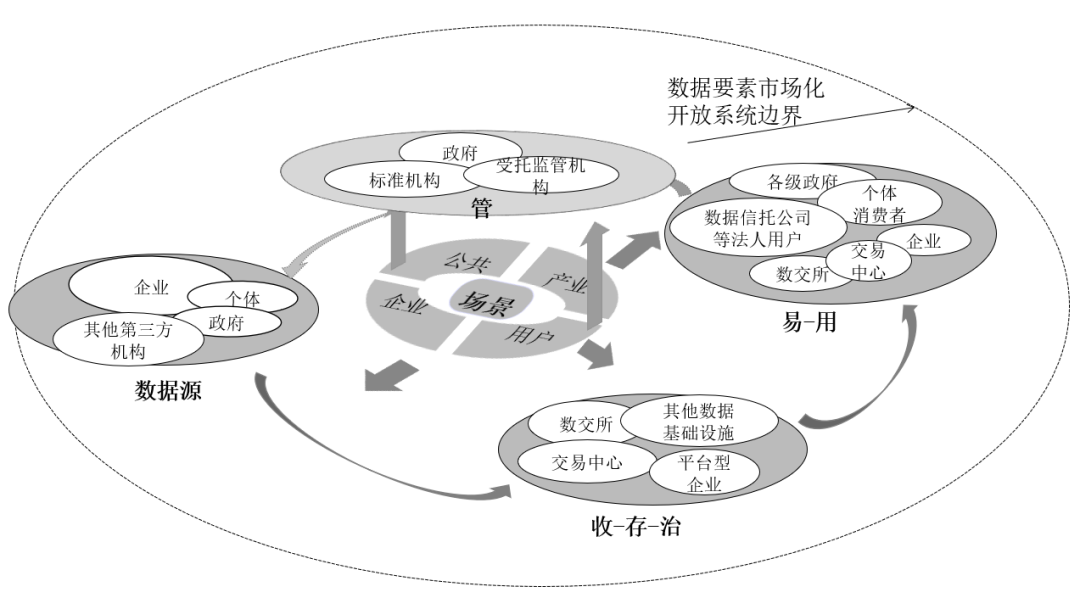 場景驅(qū)動(dòng)數(shù)據(jù)要素市場化配置既符合場景驅(qū)動(dòng)的內(nèi)涵特征,又包含數(shù)據(jù)要素市場化配置的理論實(shí)踐,其核心在于以“公共—產(chǎn)業(yè)—企業(yè)—用戶”等不同維度場景下數(shù)據(jù)要素市場化配置的重點(diǎn)和痛點(diǎn)為抓手,由數(shù)據(jù)源出方、數(shù)據(jù)“收—存—治—易—用”的各個(gè)主體共同構(gòu)成數(shù)據(jù)要素市場化配置的生態(tài)底座,由數(shù)據(jù)監(jiān)管主體發(fā)揮頂層設(shè)計(jì)與監(jiān)管功能,保障數(shù)據(jù)要素安全交易,順暢流通。其中,政府、企業(yè)、個(gè)人等作為數(shù)據(jù)源供給海量數(shù)據(jù);數(shù)據(jù)交易所、企業(yè)、數(shù)據(jù)交易中心等在“收—存—治”階段發(fā)揮主要作用,共同將數(shù)據(jù)激活,轉(zhuǎn)變?yōu)橹R狀態(tài);數(shù)據(jù)交易所、企業(yè)、各級政府、個(gè)人等結(jié)合場景需求與痛點(diǎn)參與數(shù)據(jù)的交易和使用過程,充分激活數(shù)據(jù)的場景價(jià)值;政府、標(biāo)準(zhǔn)機(jī)構(gòu)、受托監(jiān)管機(jī)構(gòu)等在此過程中承擔(dān)監(jiān)管職能,保障數(shù)據(jù)交易流通。通過多元主體的生態(tài)價(jià)值共創(chuàng)精準(zhǔn)打通數(shù)據(jù)要素市場化配置“收—存—治—易—用—管”的各個(gè)核心環(huán)節(jié),最終實(shí)現(xiàn)生態(tài)價(jià)值共創(chuàng)。