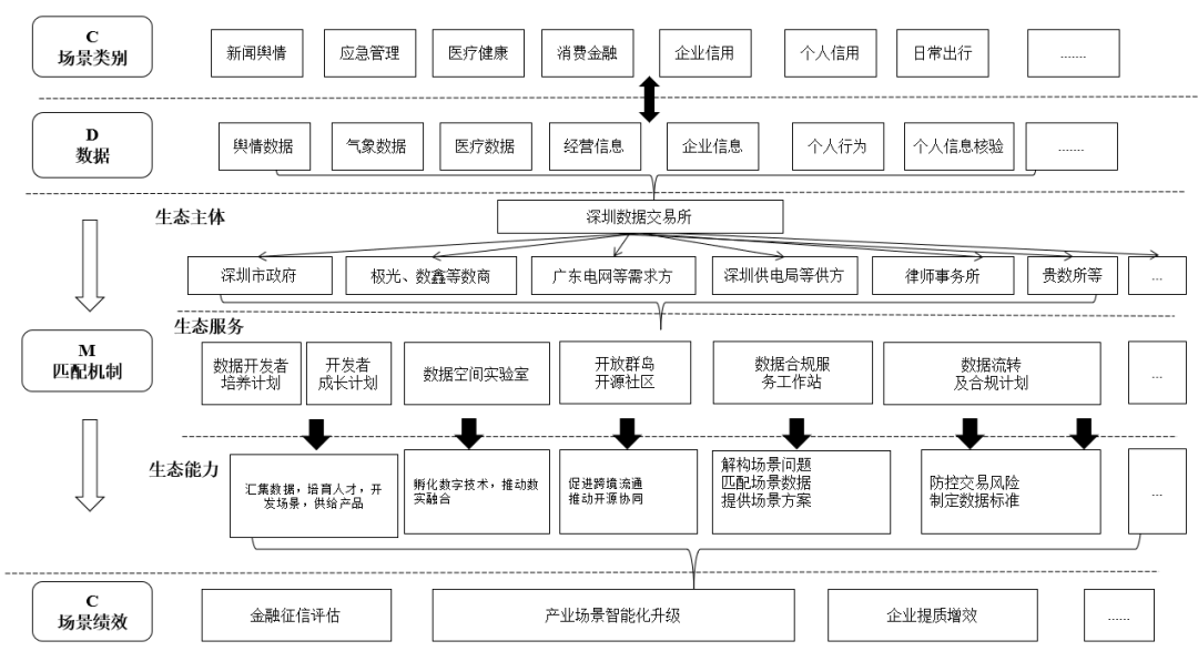 在CDM機(jī)制下,數(shù)據(jù)交易所基于公共、產(chǎn)業(yè)、企業(yè)、個(gè)人等多維場景匯聚分散無序的多元數(shù)據(jù),通過與政府、數(shù)商、數(shù)據(jù)供需雙方、合規(guī)機(jī)構(gòu)、其他數(shù)據(jù)交易平臺等生態(tài)主體合作,共同構(gòu)建以數(shù)據(jù)交易所為中心、政府與多元數(shù)商共同賦能參與、合規(guī)機(jī)構(gòu)保障、數(shù)據(jù)供需主體精準(zhǔn)對接與場景價(jià)值滿足的全要素價(jià)值共創(chuàng)生態(tài)。在此生態(tài)中,政府除提出公共維度場景問題外主要提供數(shù)據(jù)要素市場化配置的政策指引與監(jiān)管規(guī)制,負(fù)責(zé)供給數(shù)據(jù)和數(shù)據(jù)產(chǎn)品的數(shù)據(jù)商只需結(jié)合自身專業(yè)技術(shù)和業(yè)務(wù)場景打造并提供優(yōu)質(zhì)且匹配場景的數(shù)據(jù)產(chǎn)品與數(shù)據(jù)服務(wù),保障有效數(shù)據(jù)的供給質(zhì)量與數(shù)量,律所等機(jī)構(gòu)主要開展數(shù)據(jù)合規(guī)業(yè)務(wù),發(fā)揮監(jiān)管功能,為統(tǒng)籌數(shù)據(jù)安全與發(fā)展提供堅(jiān)實(shí)保障。數(shù)據(jù)交易所作為生態(tài)中心,圍繞多維場景與多元數(shù)據(jù)匹配提供數(shù)據(jù)要素生態(tài)服務(wù),構(gòu)建場景驅(qū)動(dòng)數(shù)據(jù)要素市場化配置的體系能力。一方面,通過培育場景開發(fā)者、場景解構(gòu)者并提供場景解決方案為豐富數(shù)據(jù)應(yīng)用場景、高效匹配數(shù)據(jù)場景、嵌入場景撮合交易提供有力抓手。另一方面,持續(xù)提供數(shù)據(jù)要素市場化配置全流程支持,通過鏈接數(shù)據(jù)收集、存儲、治理主體聚集數(shù)據(jù)要素與優(yōu)質(zhì)數(shù)據(jù)產(chǎn)品,牽頭研發(fā)數(shù)據(jù)交易技術(shù)提供技術(shù)保障,打通數(shù)據(jù)“收—存—治”三大環(huán)節(jié);通過匯聚各類數(shù)據(jù)要素市場交易主體建設(shè)數(shù)據(jù)交易平臺網(wǎng)絡(luò),融通數(shù)據(jù)交易樞紐;通過導(dǎo)出數(shù)據(jù)產(chǎn)品并與應(yīng)用主體建立長遠(yuǎn)的合作關(guān)系打通數(shù)據(jù)應(yīng)用市場;通過與合規(guī)機(jī)構(gòu)合作并參與制定數(shù)據(jù)標(biāo)準(zhǔn),發(fā)揮數(shù)據(jù)監(jiān)管職能,構(gòu)建面向場景的合規(guī)體系。最終通過多維數(shù)據(jù)價(jià)值釋放,充分賦能公共、產(chǎn)業(yè)、企業(yè)、用戶場景。基于CDM機(jī)制,數(shù)據(jù)價(jià)值在多次復(fù)用、多元融合與高效匹配中充分激活,并進(jìn)一步生成新數(shù)據(jù),構(gòu)建新場景,“飛輪”效應(yīng)形成,催生更加繁榮的數(shù)據(jù)要素市場化配置生態(tài)。