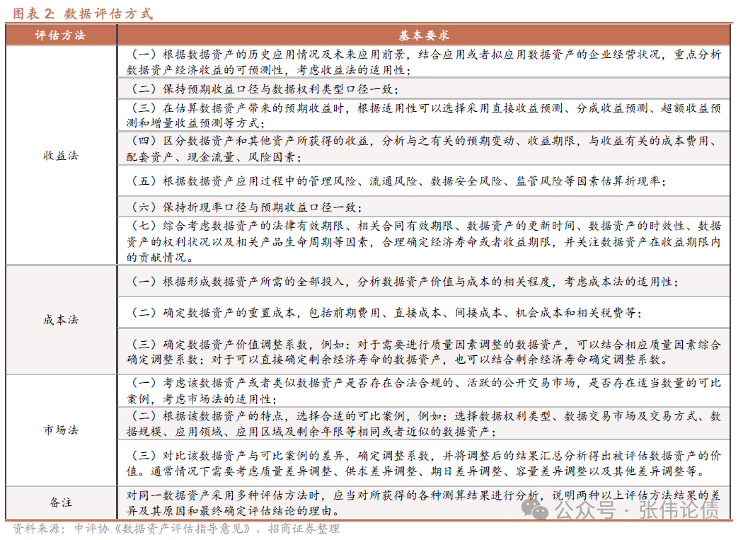 根據2023年9月8日中國資產評估協會推出的《數據資產評估指導意見》,數據資產評估主要有收益法、成本法和市場法三種評估方式。我們將三種評估方式總結如下。