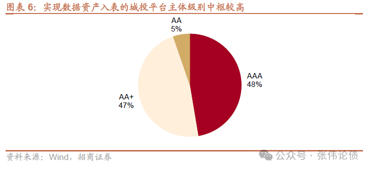 數據資產入表城投平臺基本擁有AA+或更高主體評級。19家城投平臺中,AAA、AA+和AA主體分別為9家、9家和1家,AA主體占比僅5%。這同樣說明現階段數據資產入表主要集中在優質城投平臺。