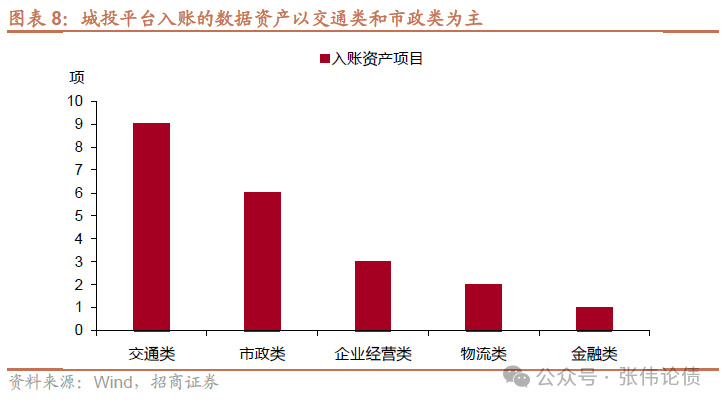 城投入表的數據資產以交通類和市政類為主,符合城投平臺基本業務屬性。我們按照數據資產情況,將城投平臺入表的數據資產分成了交通類、市政類、企業經營類、物流類和金融類等五個類別。據統計,19家城投平臺共入賬21項數據資產,其中,交通類資產入賬最多,達到9項,典型項目如城市路網車流量數據、停車場數據資源等。市政類資產入賬6項,典型項目如供熱管網數據集、社會治理和惠民服務數據集等。企業經營類、物流類和金融類數據分別入賬3項、2項和1項。整體來看,城投平臺主要業務集中在城市基礎設施投融資、市政基礎設施運營等方面,與本次入賬資產的項目類型相對匹配。