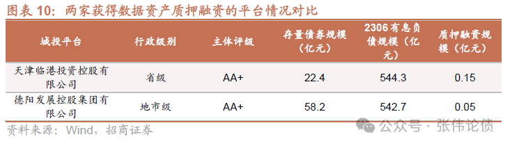 目前,天津市的天津臨港投資控股有限公司和四川省德陽市的德陽發展控股集團有限公司均已實現數據資產質押融資,融資規模分別為1500萬元和500萬元。兩家平臺均具有AA+主體評級,但天津臨港投控為省級平臺,德陽發投集團則為地市級平臺。23年6月末兩家平臺的有息負債規模分別為544.3億元和542.7億元,質押數據資產獲得的信貸規模占有息負債的比例相對較低。