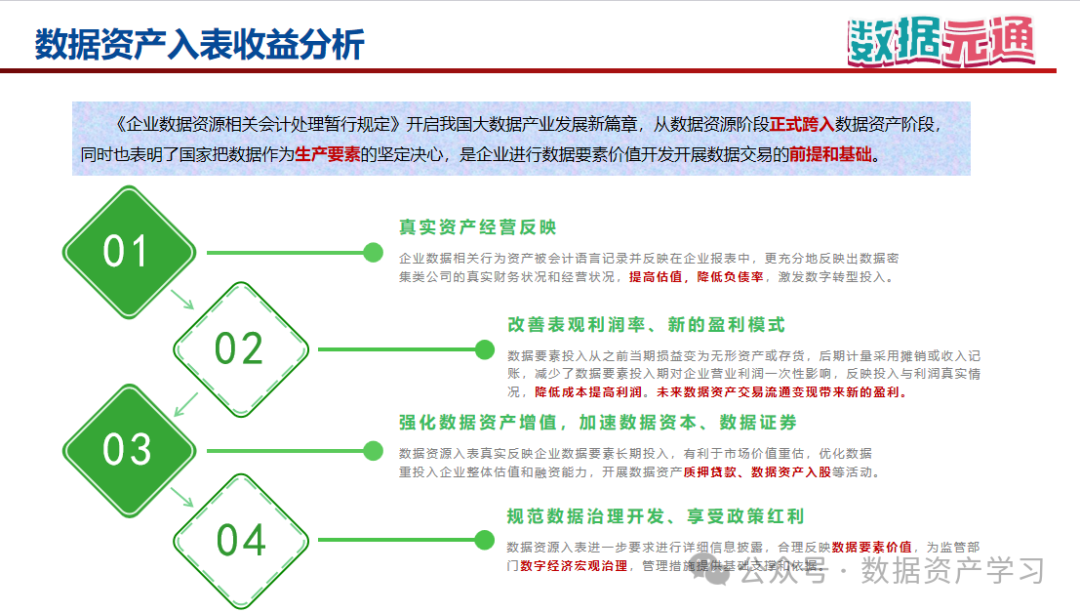 按照國家大數據及財經稅務相關政策要求,數據資產入表涉及一系列法規、條例及行為規范,為企業進一步規范數據治理、數據開發、信息披露提供實踐指導路徑,為國家數字經濟宏觀治理,數據要素乘數行動計劃提供基礎支撐和依據,及時享受國家數字經濟和數據要素紅政策利。