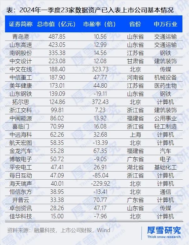以申萬行業分類來看,第一批數據資產入表的23家上市公司分布在13個行業當中,其中在計算機行業有7家,包括海天瑞聲、每日互動、中遠海科、航天宏圖、拓爾思、佳華科以及開普云,在交通運輸(青島港、山東高速)、建筑裝飾(中交設計、浙江交科)、鋼鐵(山東鋼鐵、南鋼股份)以及傳媒(卓創資訊、中文在線)這幾個行業各有2家,在醫藥生物、輕工制造、汽車以及公用事業等8個行業各有1家。行業的分布特點具有一定的分散性,顯示出數據資源涉及領域非常的廣泛。