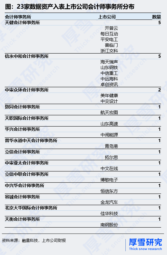 從第一批數據資產入表的23家上市公司來看,一共有14家會計師事務所參與其中,天健會計師事務所與信永中和會計師事務所一季度各自完成了5家上市公司的入表,其中天健進行服務的企業包括浙江交科、喜臨門、平安電工、每日互動以及開普云;而信永中和所服務企業包括中信重工、山東鋼鐵、中遠海科、海天瑞聲以及卓創資訊;中審眾環會計師事務所完成了2家上市公司的入表,其中包括中交設計與美年健康,另外,中興華會計師事務所、中審亞太會計師事務所、致同會計師事務所、天衡會計師事務所、天職國際會計師事務所、普華永道中天會計師事務所、容誠會計師事務所、立信會計師事務所、立信中聯會計師事務所、華興會計師事務所與北京大華國際會計師事務所各完成了一家企業數據資產入表。
