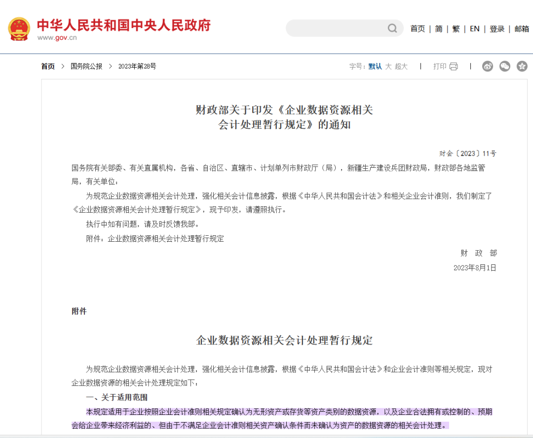 數據是數字經濟時代的基礎性資源、重要生產力和關鍵生產要素。自黨的十九屆四中全會將數據列為生產要素以來,黨中央、國務院發布多項政策文件,圍繞數據要素市場發展謀篇布局,形成了推動數據資產化的強大合力。2022年12月,中共中央、國務院印發《關于構建數據基礎制度更好發揮數據要素作用的意見》(以下簡稱“數據二十條”),提出構建數據基礎制度、充分實現數據要素價值,為數據要素市場提供了頂層設計方案。在“數據二十條”的指引下,2023年8月,財政部制定印發了《企業數據資源相關會計處理暫行規定》(以下簡稱“《暫行規定》”),明確了數據的資產屬性及入表的適用范圍、會計處理使用準則、列示和披露要求,并于2024年1月1日起正式實施。