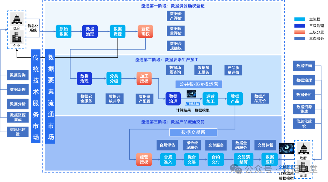 數據作為生產要素指的是在現代經濟中我們將數據視為一種重要的資源,類似與勞動力、資本和土地。核心內涵可以從三個方面概述:數據是一種新的生產力:隨著人類社會的不斷發展,生產要素也在不斷變化。最初的生產要素包括勞動力、土地和資本。然而,隨著科技的進步和工業革命的到來,新的生產要素不斷涌現,如技術、知識和創新等。這些新生產要素的引入和應用推動了生產力的提升和社會經濟的發展。數據作為一種新興的生產要素,它不僅是一種資源,而且是一種能夠被收集、存儲、分析和應用的信息形式。能夠作為獨立的維度使得它能夠為生產和決策提供更加精確、實時和全面的支持。數據驅動的生產方式:數據的引入還促使形成了一種新的生產方式,即數據驅動的生產方式。在這種方式下,數據成為了決策制定和創新的重要依據,數據挖掘分析成為了生產的關鍵環節。數據驅動的生產方式能夠更加靈活、快速的響應市場變化和需求變化,提高決策效果和創新效果。創造價值和滿足需求:數據作為生產要素的出現實質上指向了生產的本質,生產的本質在于創造價值和滿足需求。通過數據的挖掘分析,我們可以更好的了解市場需求、消費者行為、產品性能等信息,從而更加準確地預測和滿足需求。數據作為生產要素的出現不僅豐富了生產要素的含義,而且指向了生產的本質。因此, 我們需要不斷關注和探索數據的應用,以推動生產力的提升和社會經濟的進一步發展。數據要素市場化進程持續加快 隨著數據要素產業經濟的興起,國家對數據要素的重視程度不斷提升。國家在制定相關政策法規、推動數據開放共享和促進數據產業發展等方面采取了積極的措施,鼓勵和支持數據要素的收集、整合、管理和應用,為數據要素創造了良好的政策環境和發展條件。國家層面對數據要素市場化的政策導向主要強調在處理數據的合法合規,保護數據不會被非法獲取、篡改或濫用,數據的存儲、傳輸和處理過程中采用了安全的技術和加 密手段,以保障數據的完整性和機密性,推崇數據的共享和開放,以促進創新和經濟發展,倡導建立健全的數據治理機制,通過明確的政策和規范,對數據的收集、存儲、使用和共享進行規范管理。