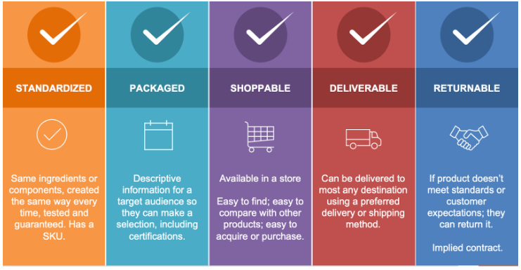 現實世界中的大多數產品都在數字商店或實體店中找到。商店是顧客購物和賣家與顧客聯系的連接點,消除了買賣之間的摩擦。在到達商店之前,產品只是資產或庫存。一旦進入商店,產品就具有促進購物過程的某些特征:它們是標準化的、包裝好的、可購買的、可交付的和可退貨的。(見圖1)。