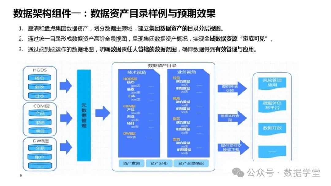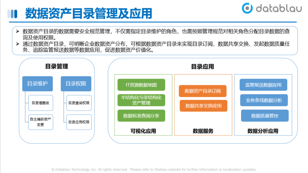 數(shù)據(jù)資產(chǎn)目錄管理包括目錄維護(hù)及目錄安全權(quán)限管理,目錄應(yīng)用場(chǎng)景有數(shù)據(jù)資產(chǎn)的可視化應(yīng)用、數(shù)據(jù)資產(chǎn)目錄服務(wù)、數(shù)據(jù)分析應(yīng)用場(chǎng)景等內(nèi)容。