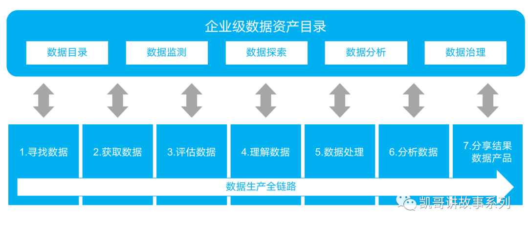 由于沒(méi)有統(tǒng)一的數(shù)據(jù)管理工具,所有的數(shù)據(jù)相關(guān)的文檔、數(shù)據(jù)產(chǎn)品和數(shù)據(jù)都分散在企業(yè)不同的系統(tǒng)中,所以當(dāng)需要數(shù)據(jù)的時(shí)候,工作人員就只能通過(guò)分散的文檔和各種溝通會(huì)議來(lái)獲得數(shù)據(jù),然后評(píng)估數(shù)據(jù)是不是完整,再進(jìn)行數(shù)據(jù)的探索和理解。如果數(shù)據(jù)不準(zhǔn)確或者不是所需要的,則又要回到原點(diǎn)去尋找數(shù)據(jù)。在數(shù)據(jù)處理和數(shù)據(jù)分析階段,相關(guān)人員如果需要更多的數(shù)據(jù),就要尋找更多的數(shù)據(jù)文檔和組織更多的溝通會(huì)議。從尋找數(shù)據(jù)開始,到數(shù)據(jù)分析結(jié)果出來(lái),再到數(shù)據(jù)產(chǎn)品構(gòu)建好,這個(gè)過(guò)程費(fèi)時(shí)費(fèi)力,并且新的數(shù)據(jù)分析結(jié)果和數(shù)據(jù)產(chǎn)品又變成了數(shù)據(jù)孤島,當(dāng)別人利用數(shù)據(jù)的時(shí)候依然需要溝通。這樣的過(guò)程低效、隨機(jī)性很大,并且很容易導(dǎo)致數(shù)據(jù)質(zhì)量問(wèn)題。當(dāng)企業(yè)構(gòu)建起數(shù)據(jù)資產(chǎn)目錄后,數(shù)據(jù)生產(chǎn)的全鏈路就形成了,如下所示。