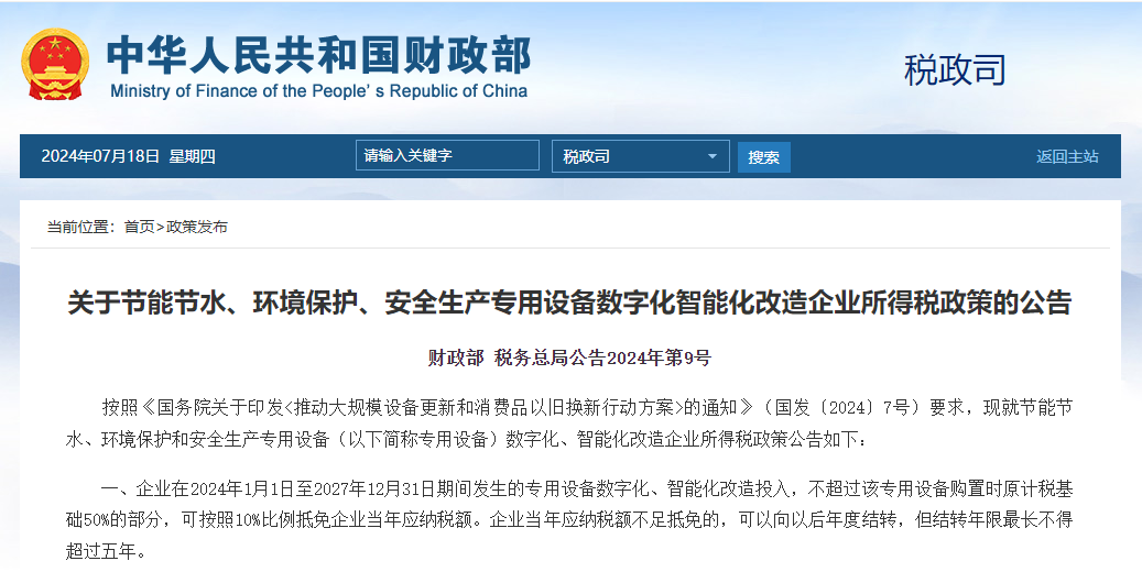 按照《國(guó)務(wù)院關(guān)于印發(fā)<推動(dòng)大規(guī)模設(shè)備更新和消費(fèi)品以舊換新行動(dòng)方案>的通知》(國(guó)發(fā)〔2024〕7號(hào))要求,現(xiàn)就節(jié)能節(jié)水、環(huán)境保護(hù)和安全生產(chǎn)專用設(shè)備(以下簡(jiǎn)稱專用設(shè)備)數(shù)字化、智能化改造企業(yè)所得稅政策公告如下: