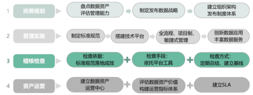 數(shù)據(jù)資產(chǎn)管理實(shí)踐的通用步驟:“統(tǒng)籌規(guī)劃→管理實(shí)施→稽核檢查→資產(chǎn)運(yùn)營(yíng)”。但各步驟之間并無(wú)嚴(yán)格的先后順序,組織可結(jié)合自身情況在各階段制定合理的實(shí)施方案。