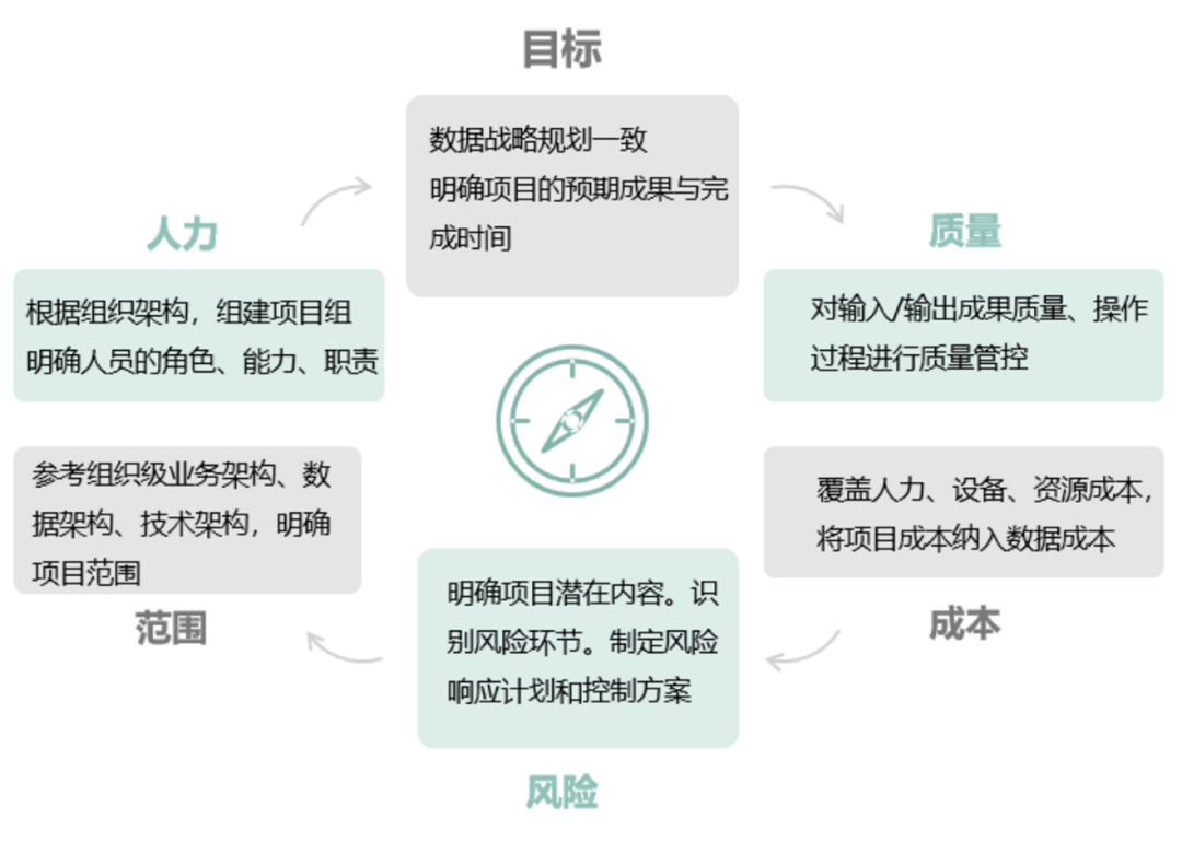 項(xiàng)目是執(zhí)行組織級(jí)數(shù)據(jù)資產(chǎn)管理的最小單元,良好的數(shù)據(jù)資產(chǎn)項(xiàng)目管理是基礎(chǔ),參考IT項(xiàng)目管理框架,主要從目標(biāo)一致性、角色合理性、范圍明確性(包括業(yè)務(wù)范圍、數(shù)據(jù)范圍、技術(shù)范圍等)、風(fēng)險(xiǎn)可控性、成本可計(jì)量、質(zhì)量可優(yōu)化等方面考慮。