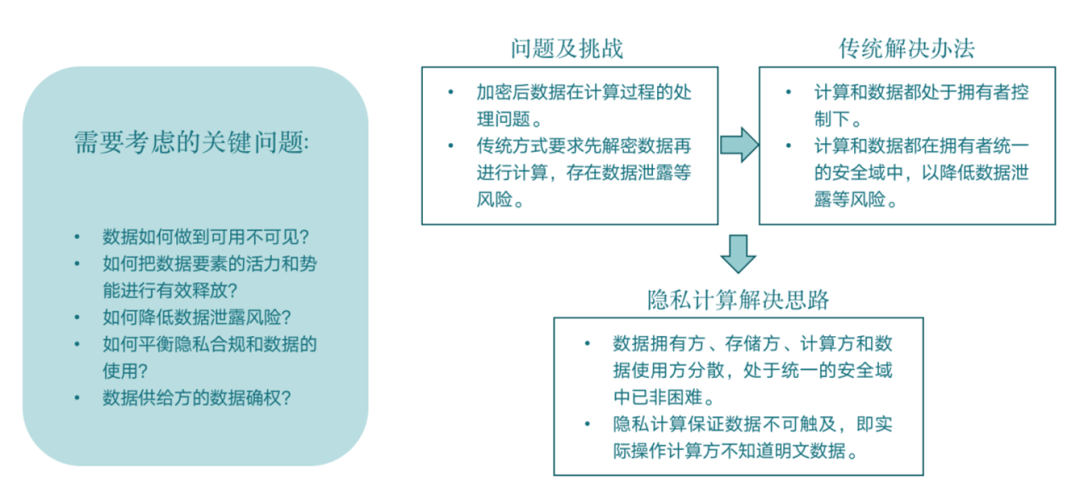 數(shù)字經(jīng)濟(jì)的發(fā)展過(guò)程中,數(shù)據(jù)隱私安全是重要保障之一。數(shù)據(jù)成為生產(chǎn)要素,即數(shù)據(jù)生產(chǎn)要素化,需要在數(shù)據(jù)流通中通過(guò)采用數(shù)據(jù)安全融合的新方式,使用數(shù)據(jù)的計(jì)算價(jià)值,解決傳統(tǒng)信息共享的發(fā)展瓶頸。