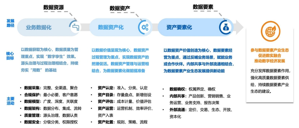 基于深厚的理論積淀與豐富的實(shí)踐探索,我們總結(jié)出企業(yè)要實(shí)現(xiàn)數(shù)據(jù)要素化并融入數(shù)據(jù)要素產(chǎn)業(yè)生態(tài)的三大關(guān)鍵階段:
