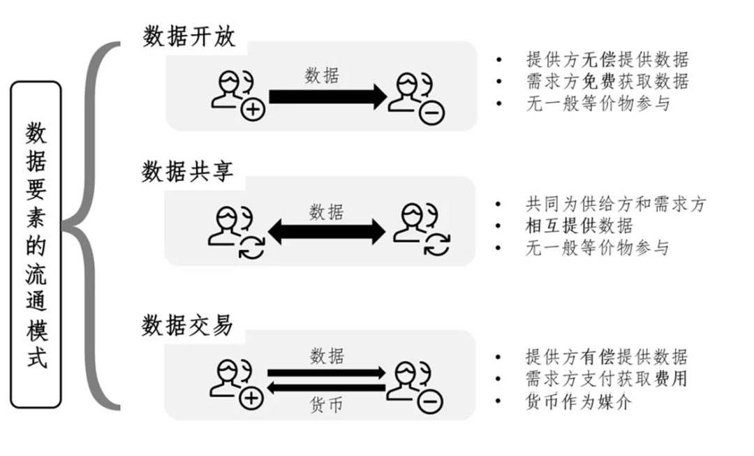 培育數據要素市場的目標是數據在各市場主體間高效有序自由流通。按照數據與資金在主體間流向的不同,可分為開放、共享、交易三種流通形式。