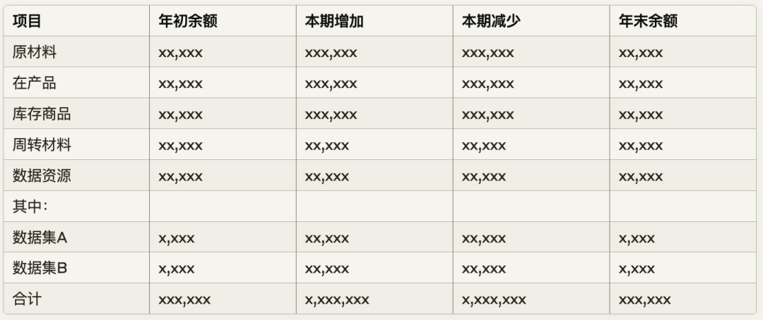 列示方式:存貨 xx,xxx 其中:數據資源 xx,xxx