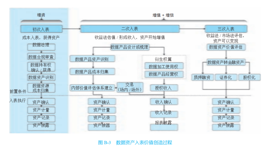 A: 如圖 B-3 所示,在實踐中,數據資源入表過程是一個分階段的價值創 造過程。