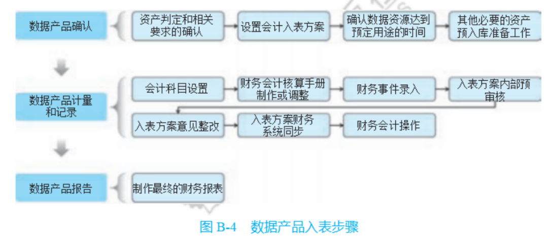 基本步驟,分為數據產品確認、數據產品計量和記錄、數據產品報告三個 階段。每個階段還包含不同的細分步驟,具體步驟見圖 B-4。詳情參見《一本書講透數據資產入表》第 9 章。