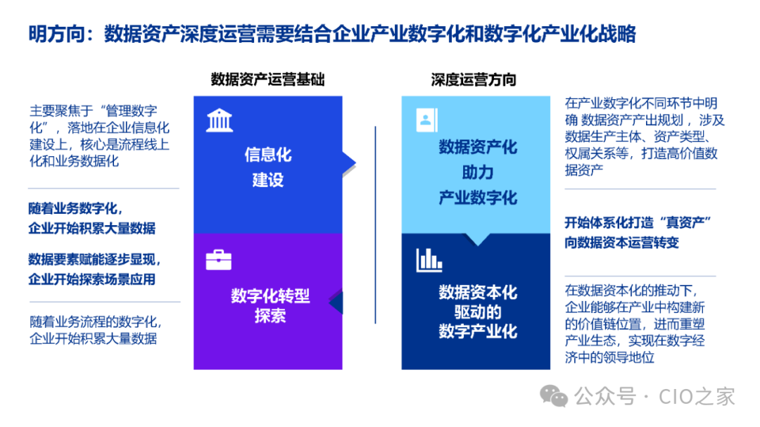 明方向:從業(yè)務(wù)數(shù)據(jù)化到數(shù)字產(chǎn)業(yè)化數(shù)據(jù)資產(chǎn)運(yùn)營不是一蹴而就的。它伴隨著企業(yè)數(shù)字化轉(zhuǎn)型的進(jìn)程,從最初的管理數(shù)字化、業(yè)務(wù)數(shù)據(jù)化,逐步發(fā)展到數(shù)據(jù)資產(chǎn)化,最終實(shí)現(xiàn)數(shù)據(jù)資本化驅(qū)動(dòng)的數(shù)字產(chǎn)業(yè)化 。這是一個(gè)不斷演進(jìn)的過程,企業(yè)需要在產(chǎn)業(yè)數(shù)字化的不同環(huán)節(jié)中,明確數(shù)據(jù)資產(chǎn)的產(chǎn)出規(guī)劃,才能在數(shù)字經(jīng)濟(jì)中占據(jù)領(lǐng)先地位。