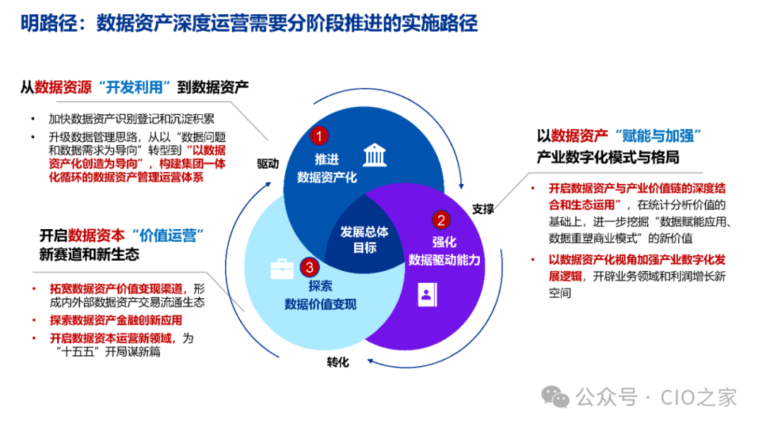 明路徑:分階段釋放數(shù)據(jù)價(jià)值數(shù)據(jù)資產(chǎn)的價(jià)值釋放需要一個(gè)循序漸進(jìn)的過程。我們需要經(jīng)歷從數(shù)據(jù)資源的“開發(fā)利用”到數(shù)據(jù)資產(chǎn)化,再到探索數(shù)據(jù)資本“價(jià)值運(yùn)營”新賽道和新生態(tài),最終以數(shù)據(jù)資產(chǎn)“賦能與加強(qiáng)”產(chǎn)業(yè)數(shù)字化模式與格局這幾個(gè)階段 。每一步都至關(guān)重要,為企業(yè)打開新的增長空間。