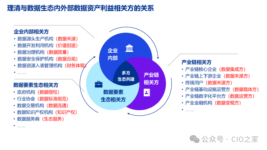 場景應(yīng)用:構(gòu)建多類型多場景的數(shù)據(jù)資產(chǎn)化實(shí)施路徑,推動(dòng)數(shù)據(jù)資產(chǎn)在各行業(yè)的創(chuàng)新應(yīng)用 。 生態(tài)共建:數(shù)據(jù)價(jià)值最大化的必由之路數(shù)據(jù)要素的價(jià)值最大化,離不開生態(tài)的支撐。我們需要理清與數(shù)據(jù)生態(tài)內(nèi)外部數(shù)據(jù)資產(chǎn)利益相關(guān)方的關(guān)系,打通數(shù)據(jù)循環(huán),實(shí)現(xiàn)合作共贏 。