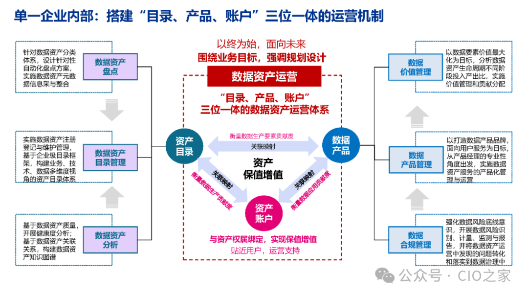 單一企業(yè)內(nèi)部:搭建“目錄、產(chǎn)品、賬戶”三位一體的運(yùn)營機(jī)制,實(shí)現(xiàn)數(shù)據(jù)資產(chǎn)的盤點(diǎn)、分析、目錄管理、產(chǎn)品管理、價(jià)值管理和合規(guī)管理 。