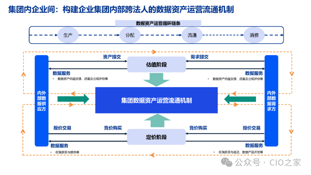 集團(tuán)內(nèi)企業(yè)間:構(gòu)建企業(yè)集團(tuán)內(nèi)部跨法人的數(shù)據(jù)資產(chǎn)運(yùn)營流通機(jī)制,實(shí)現(xiàn)數(shù)據(jù)資產(chǎn)的生產(chǎn)、分配、流通和消費(fèi),建立數(shù)據(jù)資產(chǎn)估值和定價(jià)機(jī)制 。