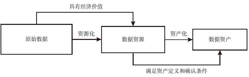 許憲春等認為數據的時效性決定了數據的使用壽命長短不一,如果數據的時效性不足一年,應被視為中間投入,故把數據資產定義為擁有應用場景且在生產過程中被反復或連續使用一年以上的數據。把數據資產界定為:以電子化形式存在,由過去事項形成,預期能為組織帶來經濟利益且該經濟利益可用貨幣計量,由組織合法擁有或控制的現時非貨幣性數據資源。認為能夠確認為數據資產的數據資源應該在過去的交易中形成,同時明確企業能夠控制,且該數據資源具有帶來未來經濟利益的潛力。本文所說的數據是指以電子或其他方式記錄下來的原始數據;數據資源是指把原始數據進行一定程度的加工處理以后,現在或者將來具備經濟價值的數據;數據資產是指滿足資產定義和確認條件,能進行貨幣計量,能入表的數據資源。三者的關系詳見圖2。