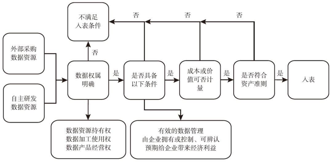 數據資源如何確認為資產進入資產負債表,目前我國會計準則、國際會計準則和美國會計準則均未給出權威的指導意見。在前文分析的基礎之上,企業能否把一項數據資源確認為數據資產,還應該進一步分析該項數據資源是否滿足資產的定義和確認條件,明確其業務模式和類別歸屬問題。
