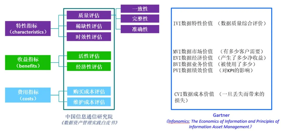 數據資產的價值衡量方法有很多,中國信息通信研究院《數據資產管理實踐白皮書》中,將數據價值評估的緯度分為數據成本評估、數據價值評估兩大類,其中成本評估包括采集成本、存儲成本、計算成本、運維成本等四類,價值評估包括活性評估、質量評估、稀缺性評估、時效性評估以及經濟性評估等五類。同時,國外知名研究機構Gartner將數據的價值分為特性價值、市場價值、經濟價值、業務價值、績效價值、成本價值等六個緯度。